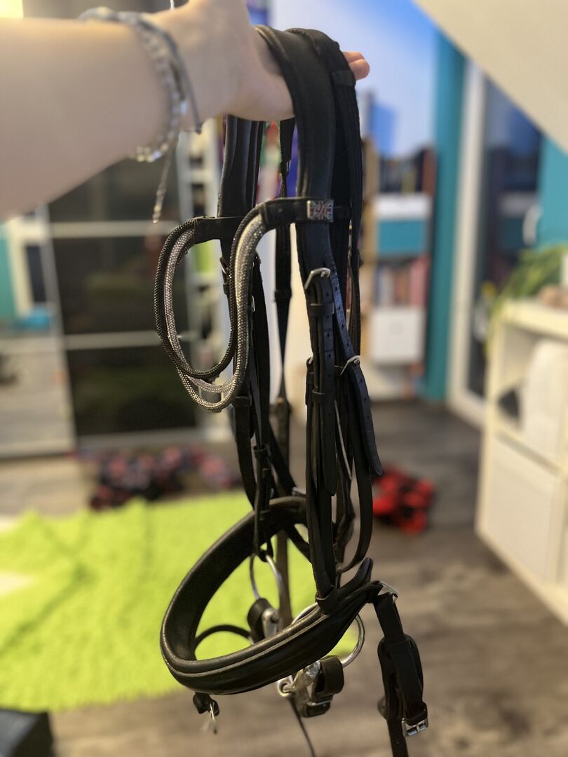 Ich biete hier ein hübsche schwarze Trense mit einem mit Lack überzogenen Nasenriemen und anatomisch geformten Genickstück. Der Lack hat keinerlei Kratzer. Die Trense an sich jedoch ist stark gebraucht. Die Zügel müssen sicher bald ersetzt werden ich würde sie dennoch dazu geben. Ich hatte die Trense auf meinem Pony, also in Größe Cop genutzt. Daher ist auch ein doppelt gebrochenes Gebiss in der Länge 11,5 cm dabei. Den Stirnriemen habe ich selbst wieder in Benutzung genommen, daher steht dieser nicht mehr zum Verkauf.