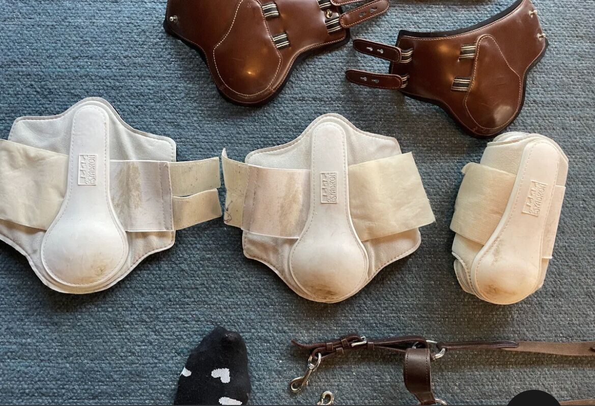 Wegen Aufgabe des Reitsports verkaufe ich meine Sachen. Sie sind in guten Zustand, besonders die braunen Gamaschen, Transportgamaschen und Vordergeschirr sind top in Schuss. An den Scharbracken sind innen Pferdehaare, aber sie sind gewaschen und absolut in Ordnung. Ein Foto zeigt das Ganze am Pferd. Wir wissen alle was diese Dinge kosten, also warum nicht günstig gebraucht kaufen? Viel Spaß!