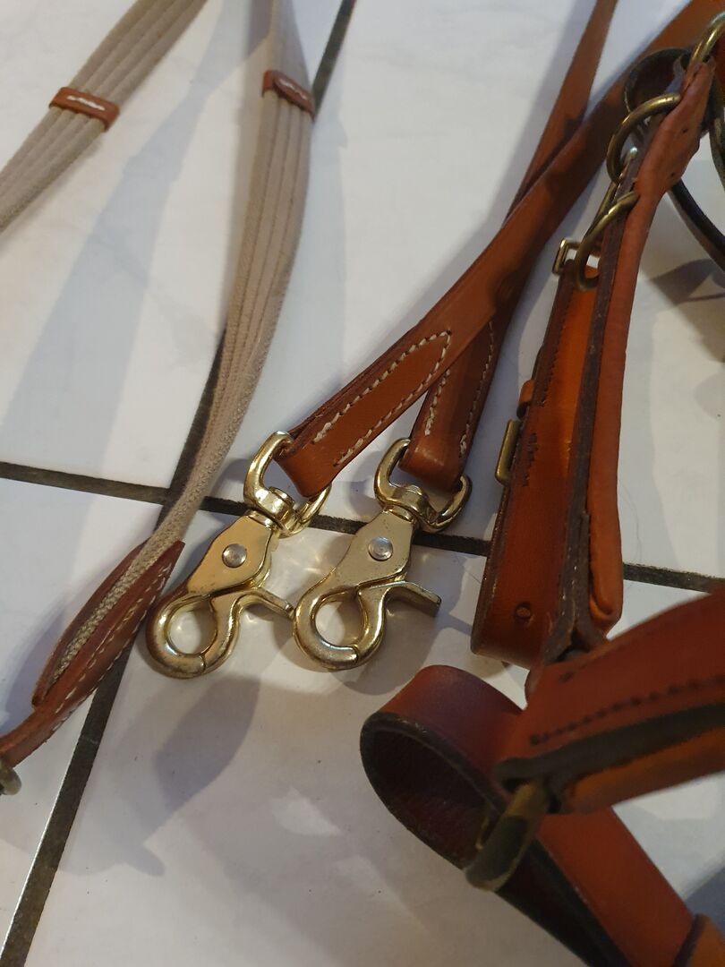 Trensen Größe Warmblut- und in diesem Zaum in beide Richtungen Platz enger oder weiter zu stellen. Das Gebiss ist an Lederriemen einzuschnallen, die mit einem Karabiner für Reitpausen oder Hängerfahrten ausgeschnallt weden können. Dazu gebe ich die separat dazu gekauften Zügel mit Snaps und ein zusätzliches Leder-Genickpolster in passender Farbe.
