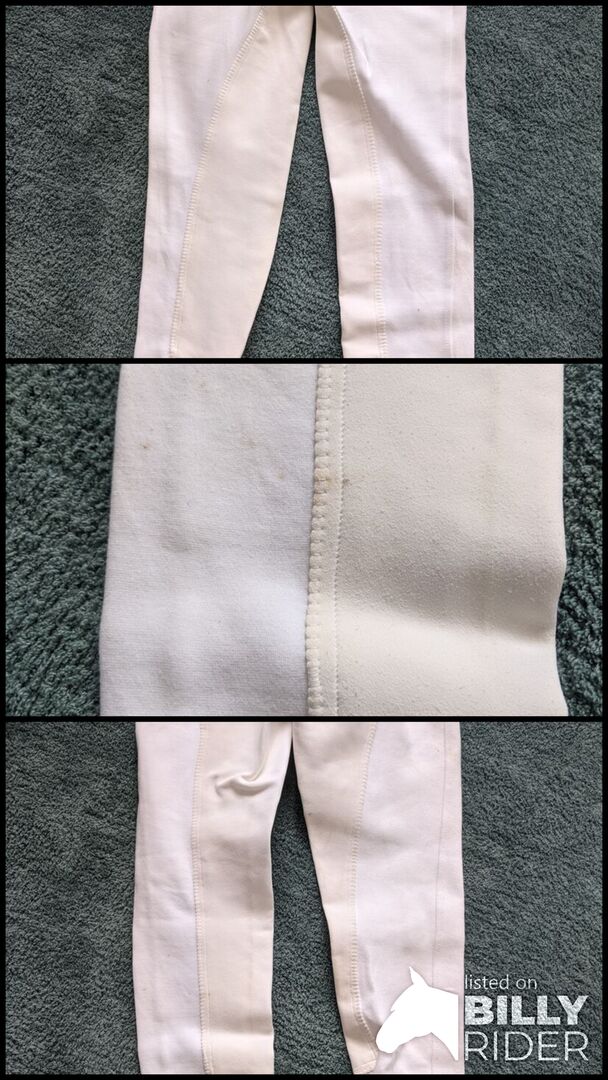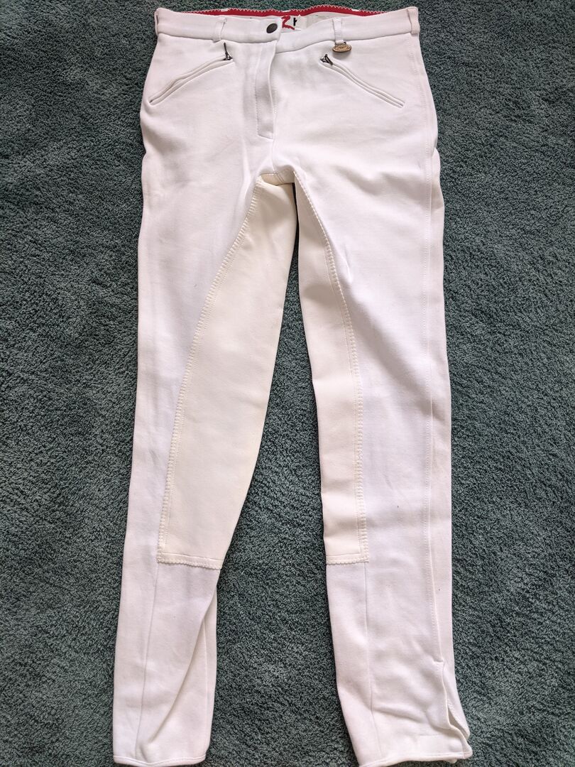 Hallo, die Hose ist Größe 36, fällt aber klein aus. Baumwolle und grundsätzlich in einem guten Zustand, alles funktioniert, bis auf ein paar kleine Grasflecken am linken Unterschenkel ist sie auch super weiß.