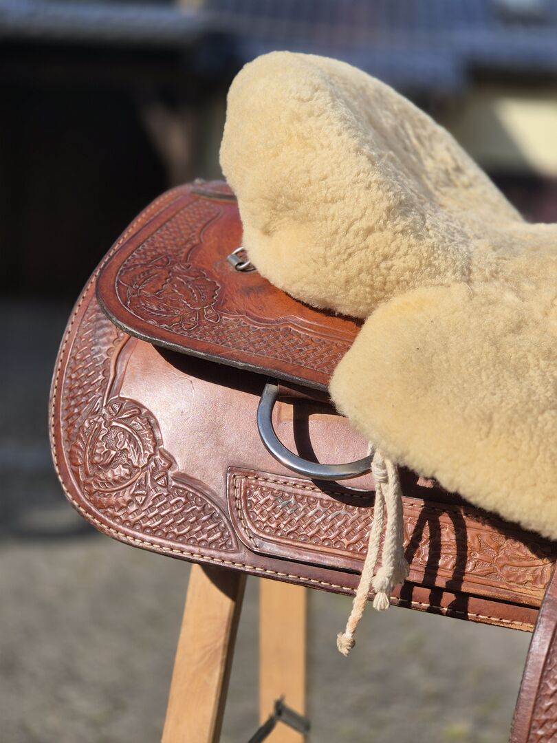 Westernsattel mit aufwendig floral punziertem Leder und echtem, weichem Lammfellbezug – ideal für lange Ausritte und höchsten Komfort im Sattel.
