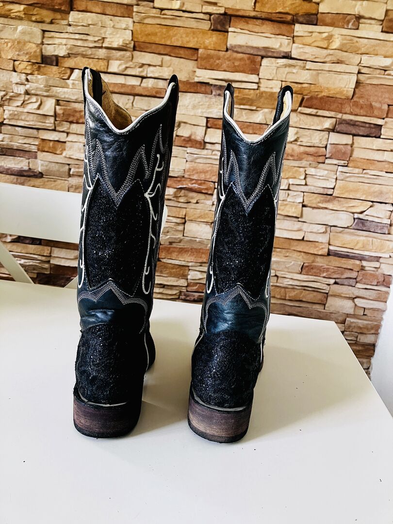 Wunderschöne Cowboystiefel der amerikanischen Marke Tanner Marks mit aufwändigen Verzierungen und Glitzerelementen. In den USA gekauft und wenig getragen. Echt Leder. Hoher Neupreis: 209 Dollar US Grösse 6,5 fällt aber klein aus. Würde 37/38 deutsche Größe annehmen. Sohlenlänge 24 cm. Schmal geschnitten