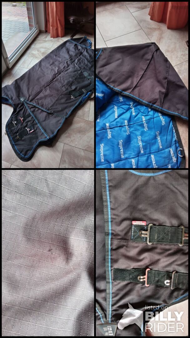 Gefütterte Weidedecke , robustes Außenmaterial. High Neck und zwei breite T- Brustverschlüsse, die etwas verstellbar sind. Innenmaterial Nylon - sehr fellfreundlich. Wasserdicht und atmungsaktiv ( zwei klitzekleine Löcher, die aber nicht gestört haben). Können mit Fahrradfluckzeug Rep werden. Schweiflatz extra groß.Gehfalten sind großzügig geschnittenen, daher optimale Bewegungsmöglichkeit. Füllung der Decke 200-250 gr. Sie wurde für 15 € professionell gereinigt. Ich habe PayPal und freue mich auf Anfragen.