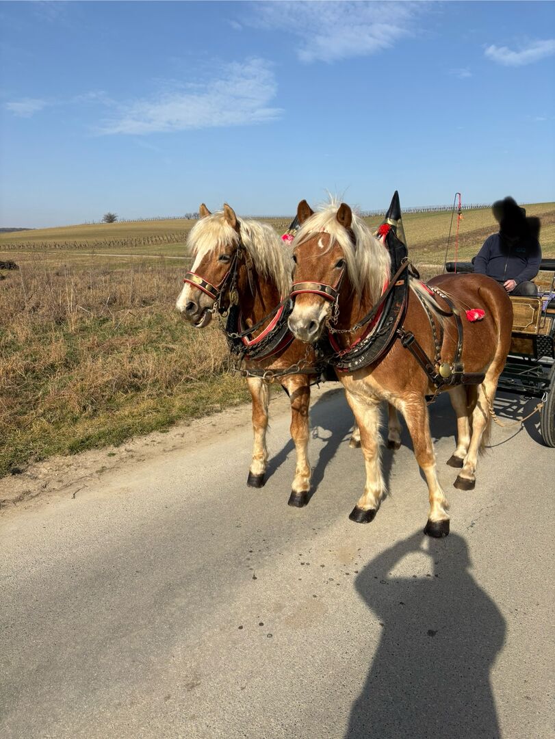 Die zwei Haflinger, ein Wallach 6 Jahre und ein Hengst 18 Jahre, werden nur zusammen verkauft. Im Preis inbegriffen sind die zwei Haflinger, Kutsche und sämtliches Zubehör.