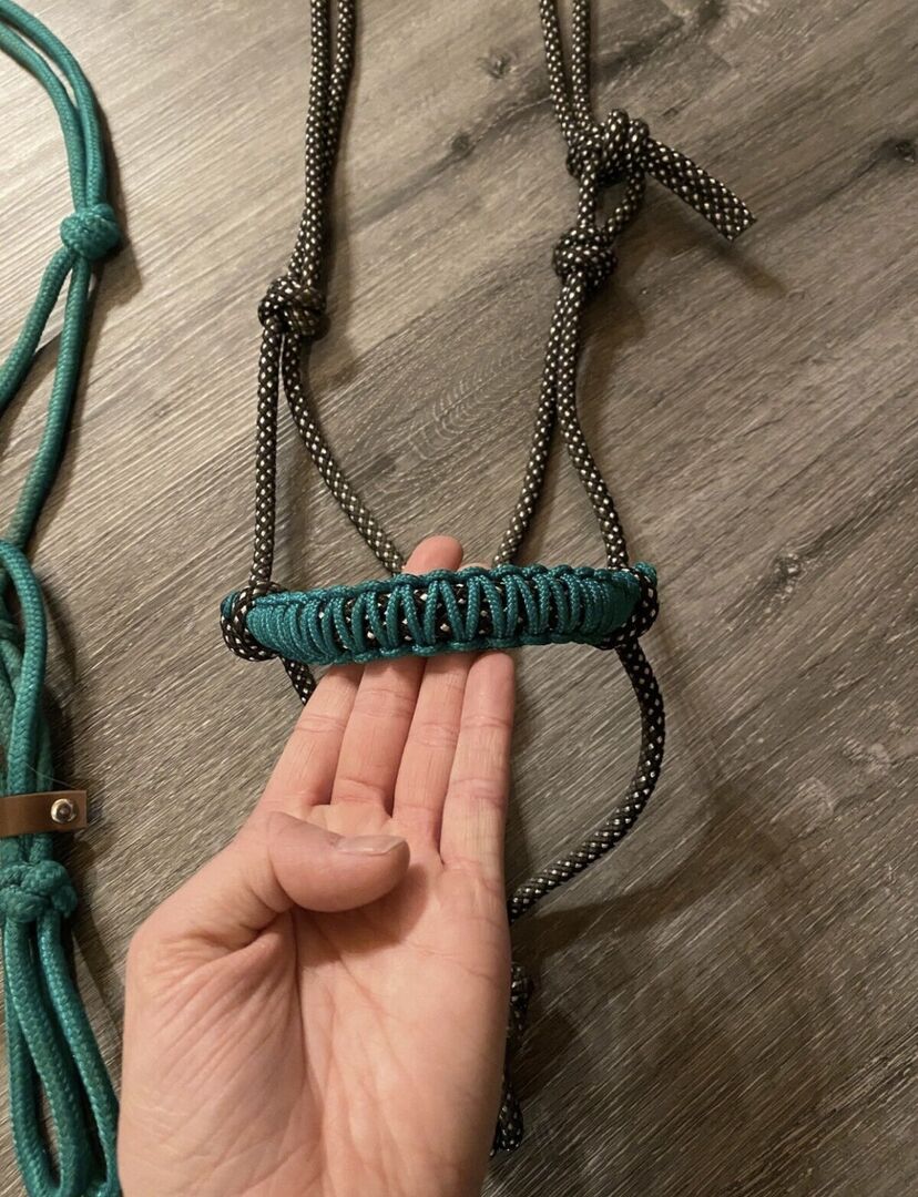 Dieses Knotenhalfter habe ich selbst gemacht, die knoten sind schön gefestigt. Allerdings ist mir damals beim knoten ein Fehler unterlaufen und man muss es auf der rechten Seite verschließen statt auf der linken. Mich hat es aber nie gestört, darum ist es auch nie geändert worden. Ebenso hat dieses Halfter 2 Ringe, damit man mit diesem Halfter auch reiten könnte. Um ein verrutschen bei der Arbeit zu verhindern wurde noch ein biothane Stück angebracht welches beweglich ist, damit man das Halfter etwas fester am Pferde Kopf anbringen kann.