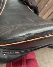 Verkaufe schicken Dressursattel mit orangenen Nähten. Er ist ein Monoblatt mit 17,5 Zoll und einer Auflagefläche von 42cm. Der Sattel hat gewöhnliche